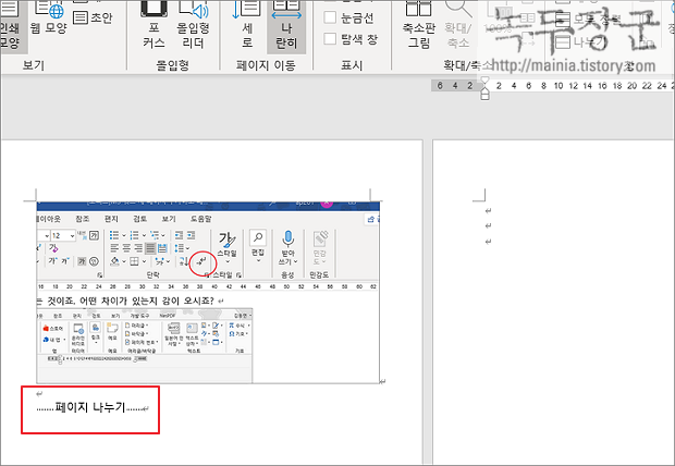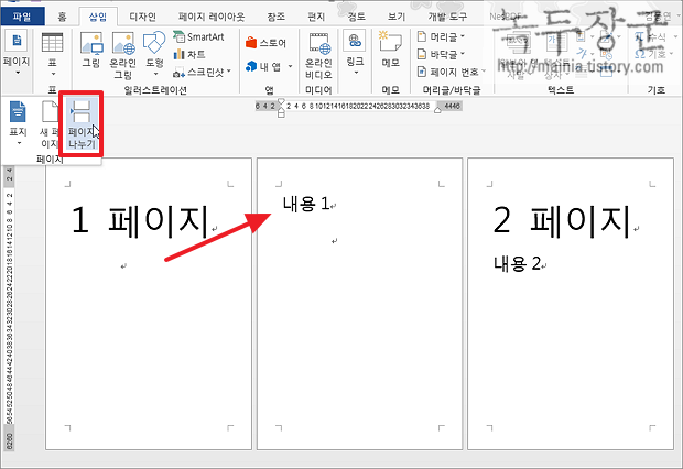 ▼ 그럼 페이지 나누기는 어떻게 될까요? 커서가 있는 위치 다음에 있는 내용을 분리해서 새로운 페이지를 만듭니다. 하나의 새 페이지가 생성되는 것이죠. 어떤 차이가 있는지 감이 오시죠?