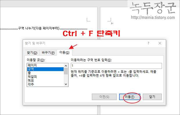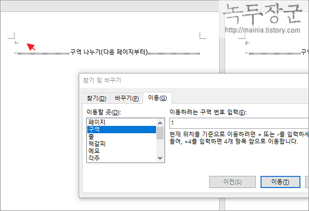 ▼ 페이지가 길고 여러 구역으로 나누어져 있는 경우 구역 이동을 이용해 보세요. 찾기 및 바꾸기 창의 이동 탭에는 구역 이동도 제공합니다. 이동 탭 > 구역을 선택하고 이동 버튼을 클릭합니다.