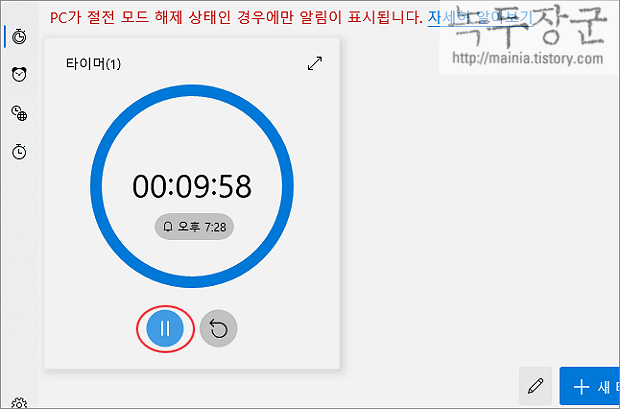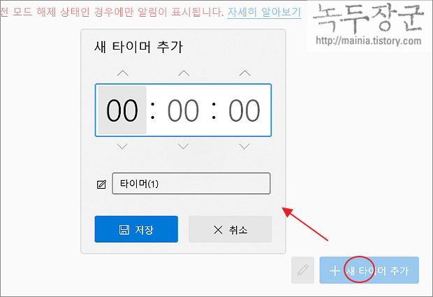 ▼ 첫 번째 메뉴인 타이머는 모래 시계와 같이 일정한 시간 간격으로 숫자를 내려 끝나는 시간을 측정합니다. 오른쪽 하단에 새 타이머 추가 버튼을 눌러 시간과 제목을 넣고 저장합니다.