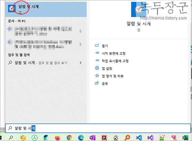 ▼ 먼저 검색창에서 알람 및 시계 앱을 찾아 실행합니다.