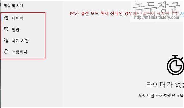 ▼ 알람 및 시계 앱이 뜨면 왼쪽 사이드에 4개의 메뉴를 볼 수 있습니다. 메뉴는 "타이머", "알람", "세계 시간", "스톱 워치" 입니다.