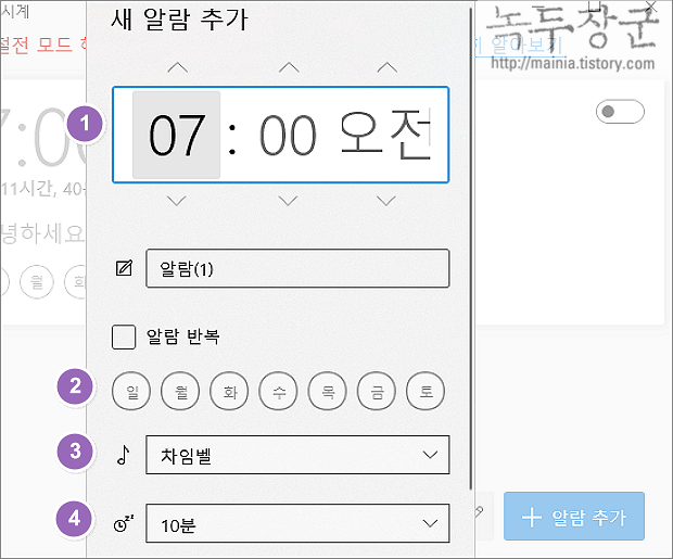 ▼ 새 알람 추가 창에서는 알람 시간과 이름, 반복 여부, 벨 종류, 재 알람 간격을 지정합니다.