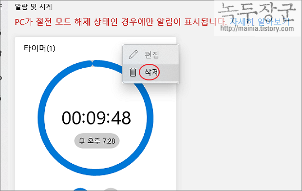 ▼ 타이머 카드 삭제는 간단합니다. 삭제를 원하는 타이머 위에 오른쪽 마우스를 누른 후 삭제 메뉴를 선택합니다.