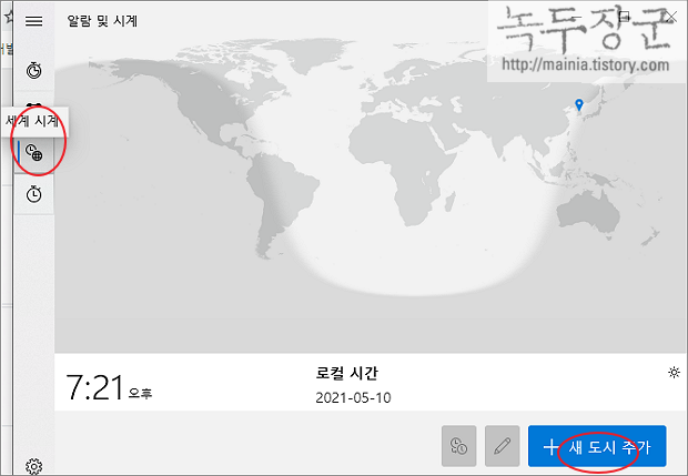 ▼ 세 번째 기능은 세계 시계 입니다. 전 세계 도시를 기준으로 현재 시간을 표시하는 아주 유용한 기능입니다. 해외 여행이나 출장 가서 한국과 연락할 일이 있을 때 자주 사용합니다. 추가하고 싶은 나라의 도시가 있다면 오른쪽 하단에 새 도시 추가 버튼을 클릭합니다.