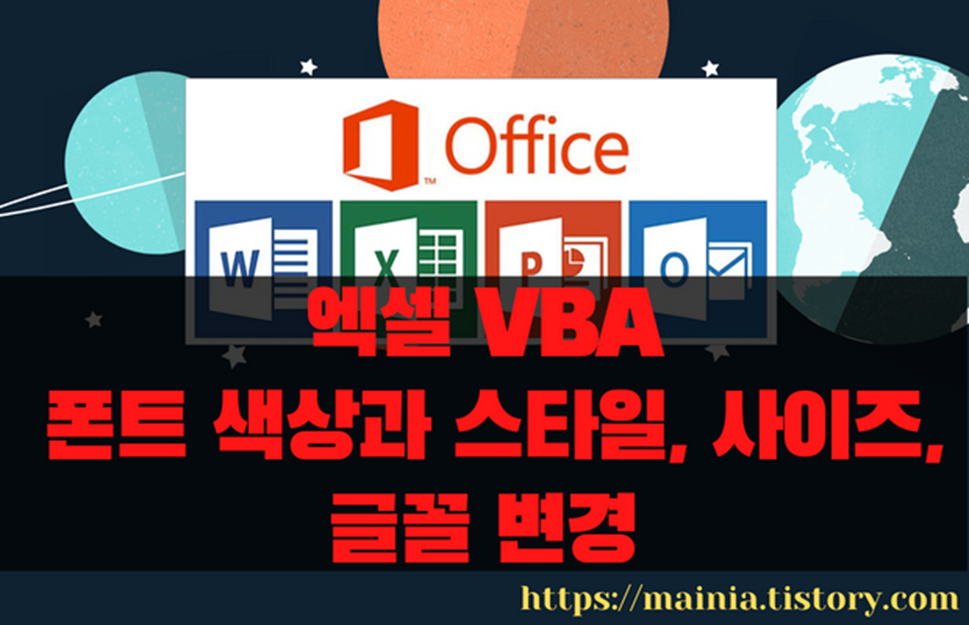 엑셀 리본 메뉴에서 사용하고 있는 글꼴 관련 옵션은 VBA 에서 모두 적용이 가능합니다. [홈] 탭의 [글꼴] 그룹에 있는 서식관련 옵션들을 VBA 코드로 하나씩 적용해 보려고 합니다. 아래에서 언급한 소스는 글꼴 종류, 글꼴 사이즈, 글꼴 스타일, 글꼴 색상에 대한 코드입니다.