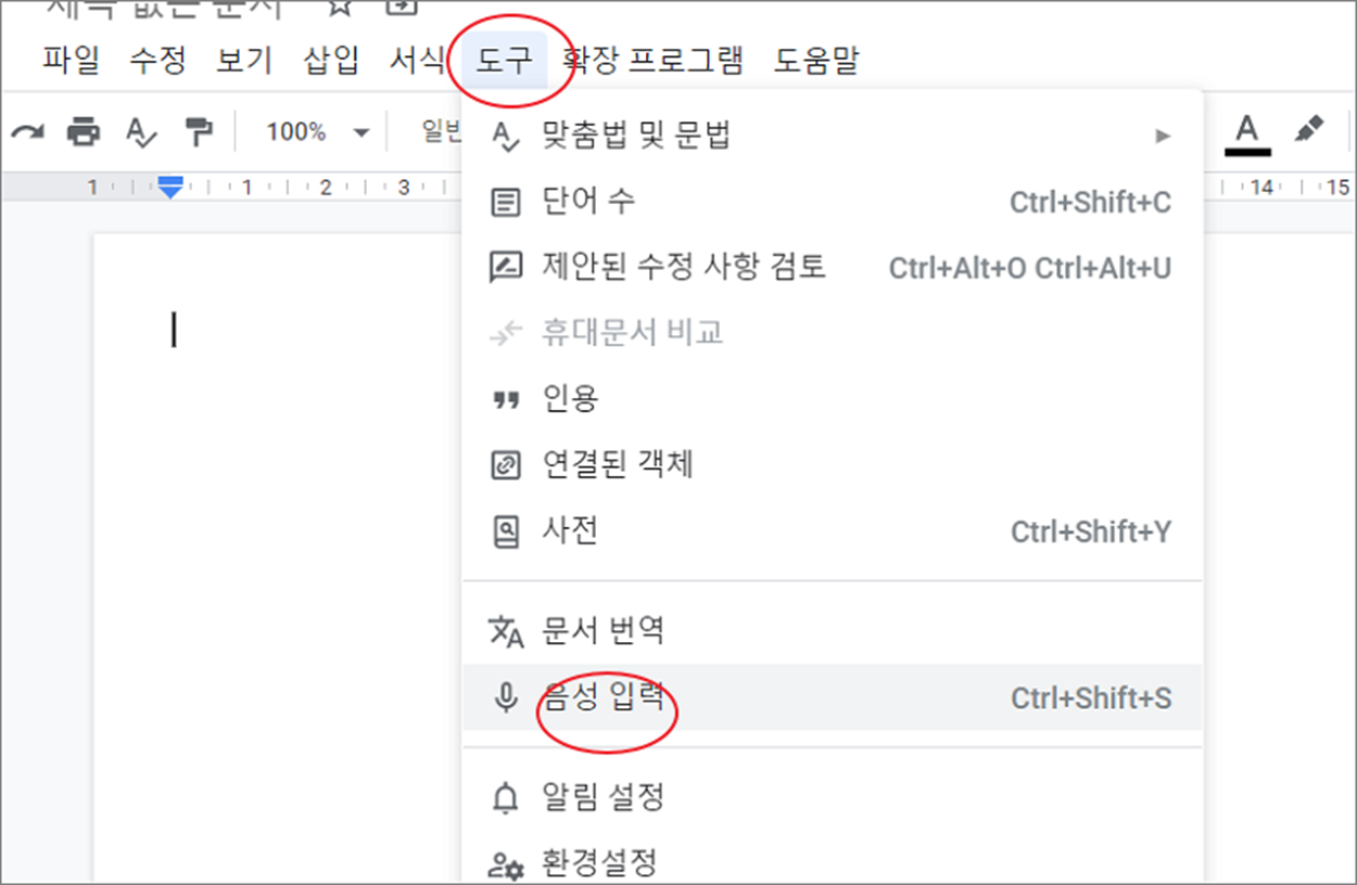 ▼ 문서에 음성 입력을 위해서는 음성 입력 서비스가 실행되어 있어야 합니다. 단축키 [Ctrl + Shift + S] 나 [도구] > [음성 입력] 메뉴를 클릭해서 서비스를 시작합니다.