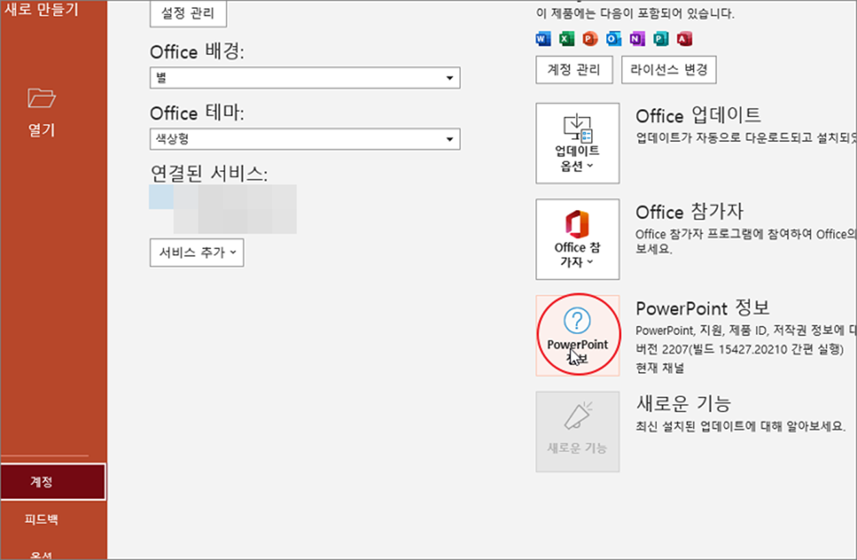 ▼ 계정 화면에서 오른쪽으로 가시면 제품 정보를 볼 수 있습니다. 오른쪽 항목 중 [PowerPoint 정보] 버튼을 클릭합니다.