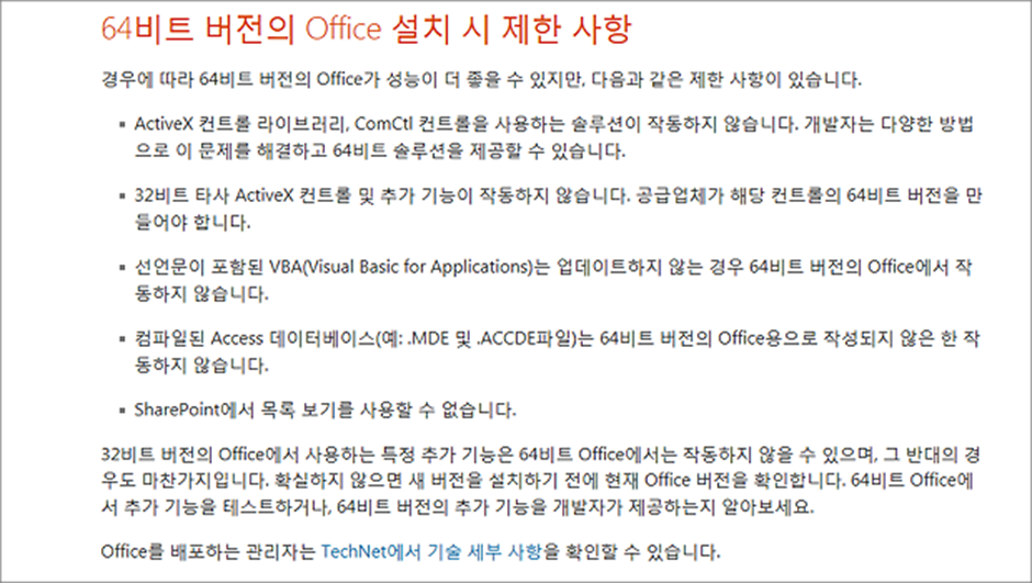어느 날 파워포인트에 PDF 파일을 첨부하는데 에러가 나더군요. 여러 방법을 찾아서 실행해 보았지만 해결이 되지 않았습니다. 그림에 나와 있는 것처럼 64bit 일 경우 여러가지 제약 사항이 있다고 합니다. 저의 문제도 64bit 호환성 문제라고 결론을 짓고 컴퓨터에 설치된 오피스 프로그램을 32bit 비트로 변경하기로 했습니다. 그림에 나와 있는 글에서 구체적으로 언급된 것은 없지만 마이크로소프트 지원센터에서 PDF 첨부 에러가 날 때 32bit 로 변경해 보라고 하더군요.