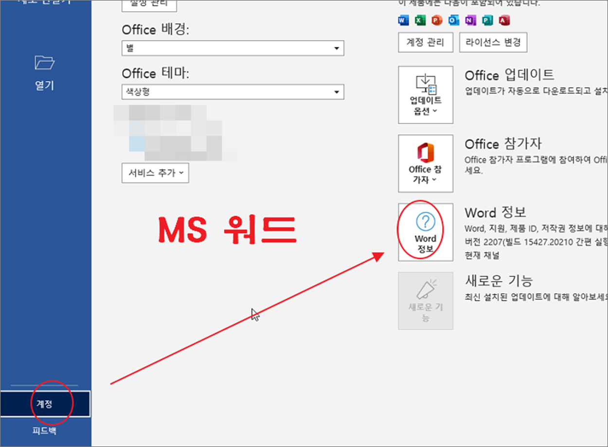▼ 다른 오피스 프로그램에서 확인하는 방법도 동일합니다. 프로그램을 실행하고 계정 > Word 정보 항목을 클릭합니다. 팝업창에 나와 있는 워드 정보에서 비트 정보를 확인합니다.