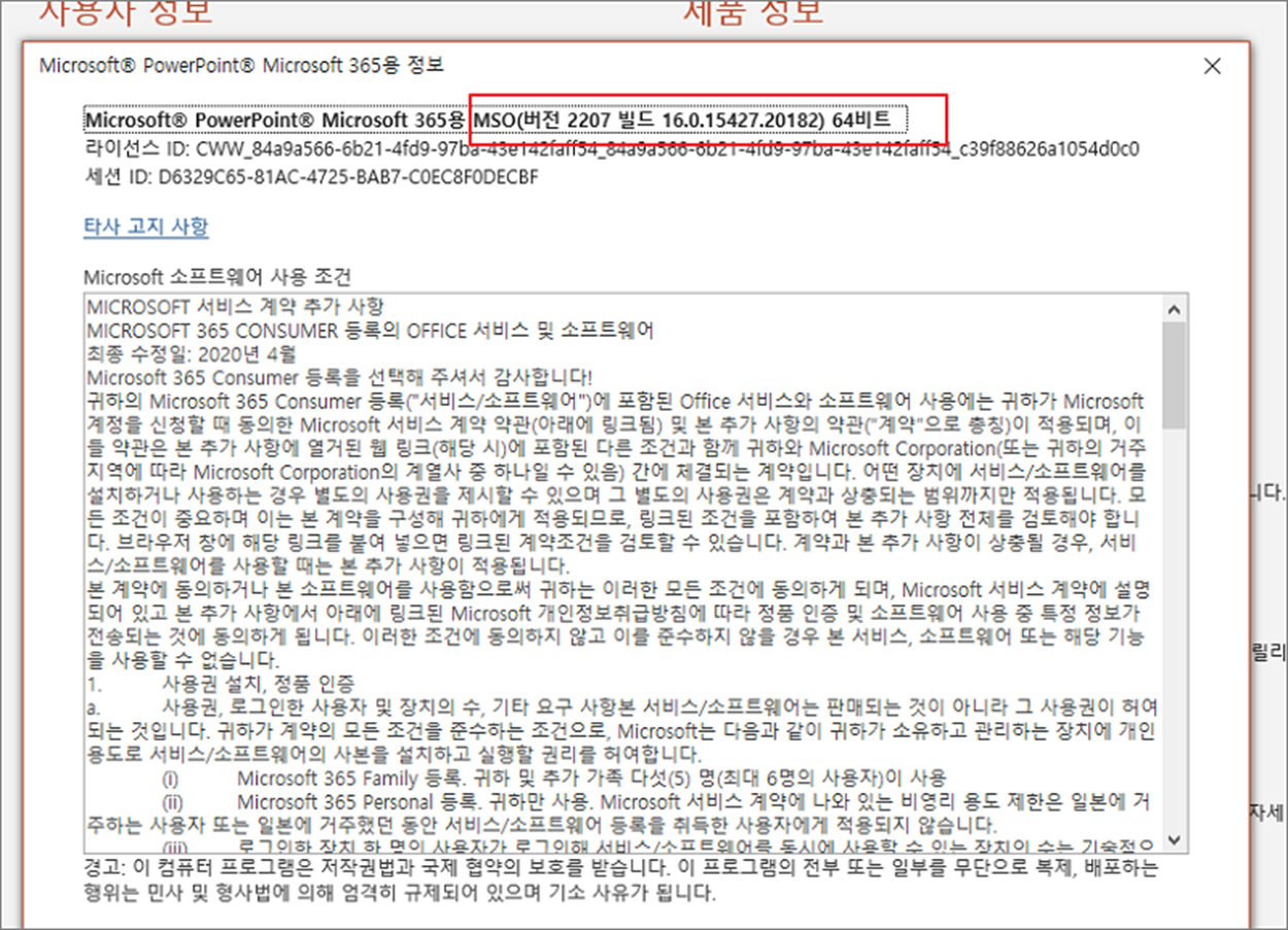 ▼ 파워포인트 정보창 상단에 제품명과 빌드 버전 정보가 나타납니다. 그리고 끝에 비트 정보가 있는데, 64비트라고 나와 있네요.