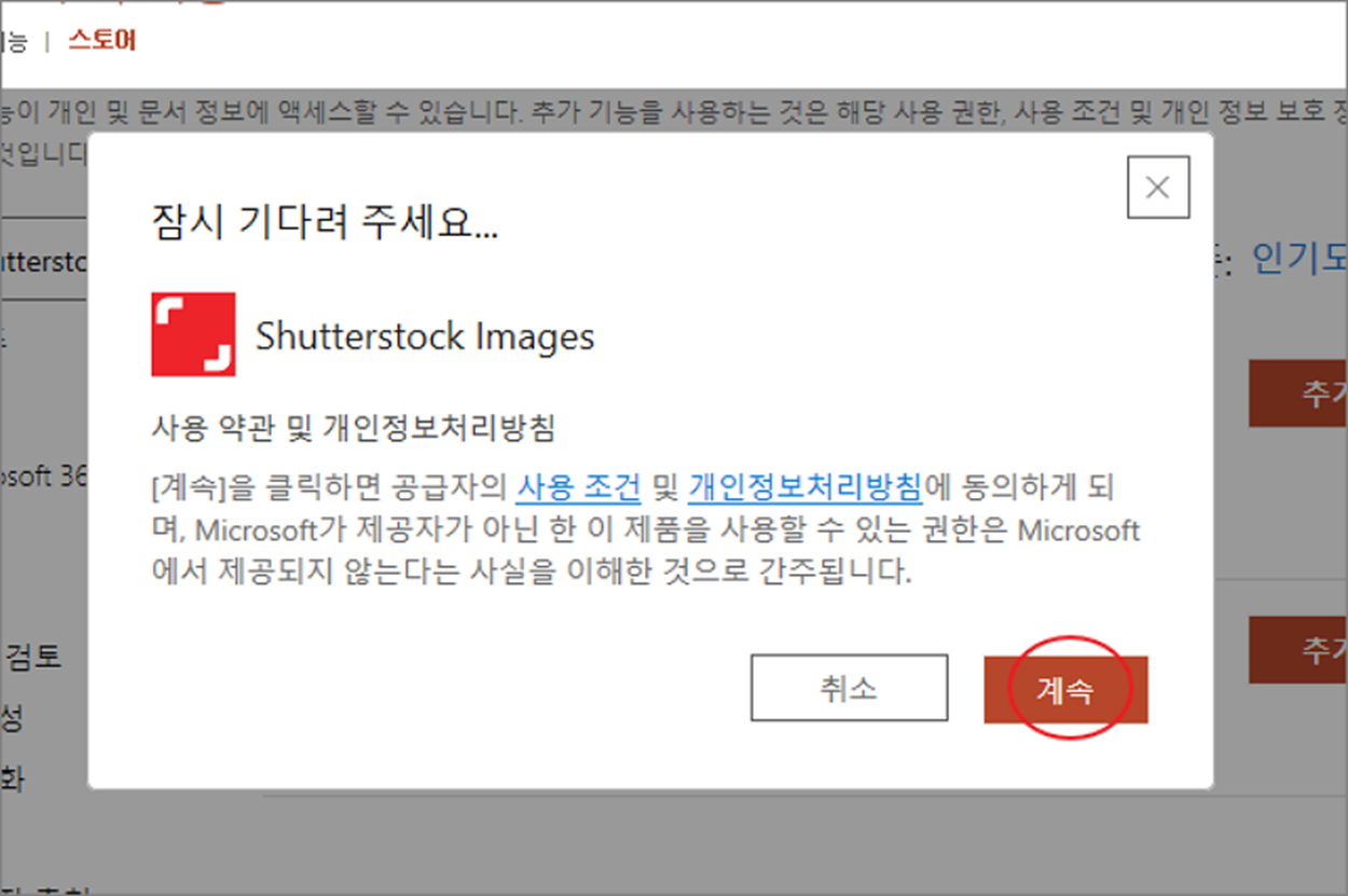 ▼ 사용 약관 및 개인정보처리방침에 동의하기 위해 계속 버튼을 클릭합니다.