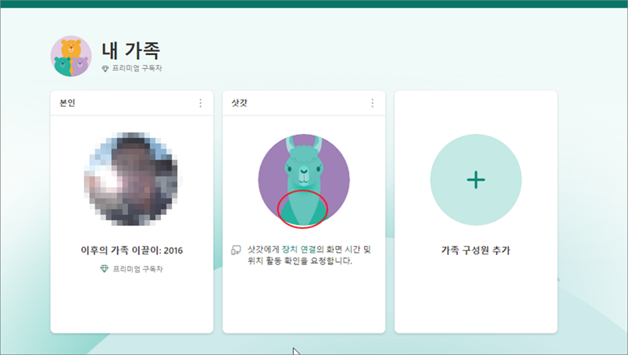 ▼ 추가한 구성원의 컴퓨터 사용 시간을 조절해 보겠습니다. 구성원 계정 정보에 추가한 가족 카드를 클릭합니다.