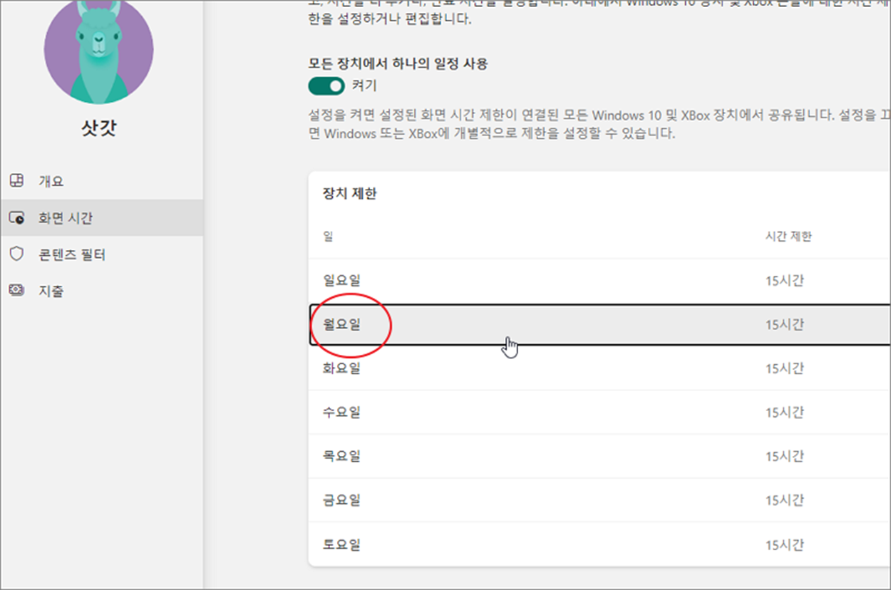 ▼ 일별 사용 가능 시간 및 허용 시간은 요일 별로 제어가 가능합니다. 총 사용시간을 측정해서 제한하거나 특정 사용시간을 지정해 주는 두 가지 방식이 있습니다. 시간을 설정할 요일을 클릭해서 설정 화면을 띄웁니다.