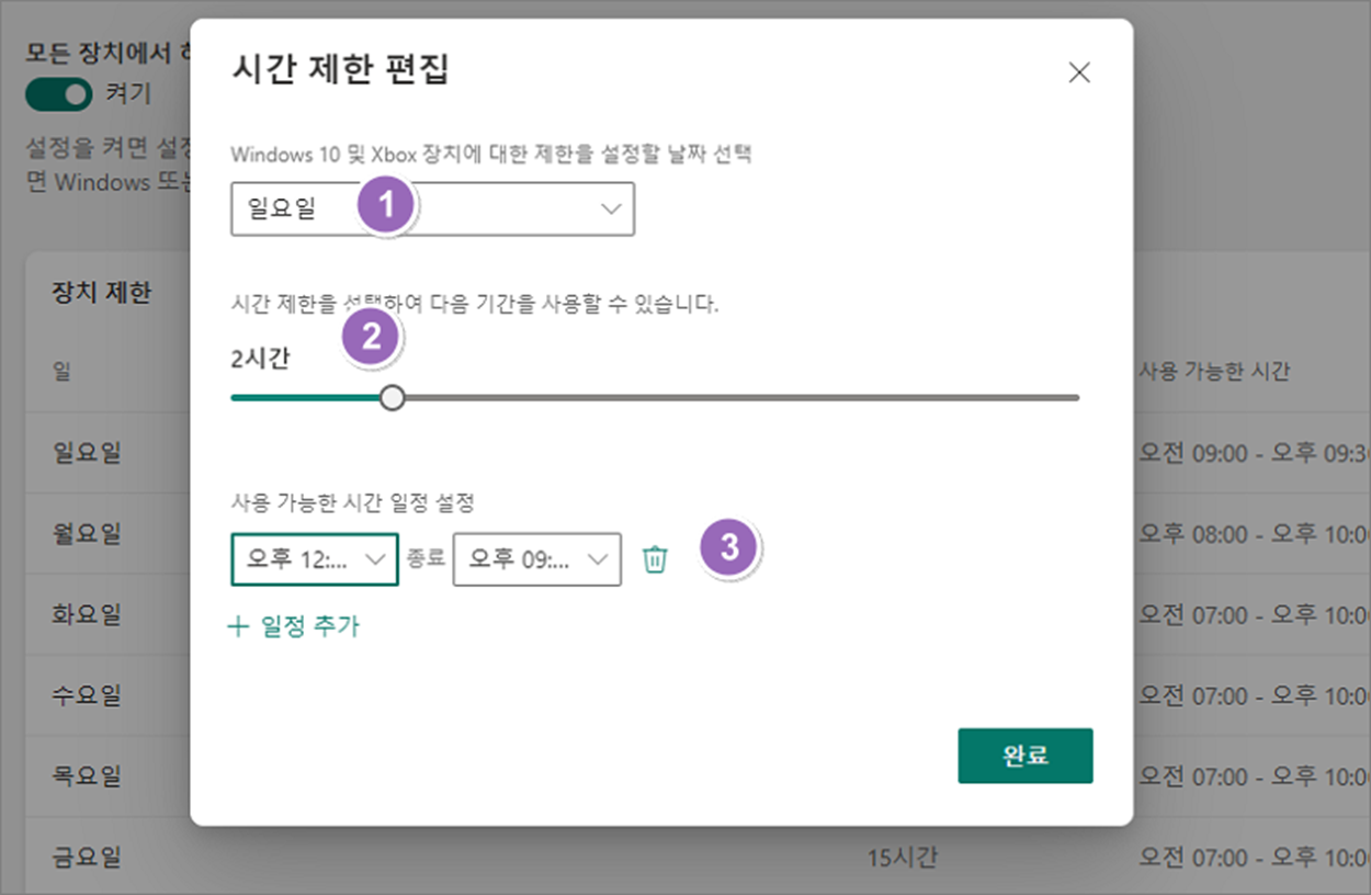 ▼ 화면에 나타난 시간 제한 편집 팝업창에서 번호 순서대로 옵션을 조절합니다. 요일과 사용할 시간, 사용 가능한 시간대 영역을 지정합니다. 설정이 끝났다면 오른쪽 하단 완료 버튼을 클릭합니다. 이런 식으로 모든 요일에 자녀가 사용가능한 시간대와 시간을 지정합니다.
