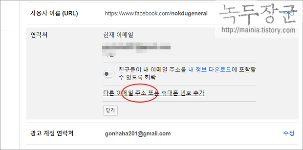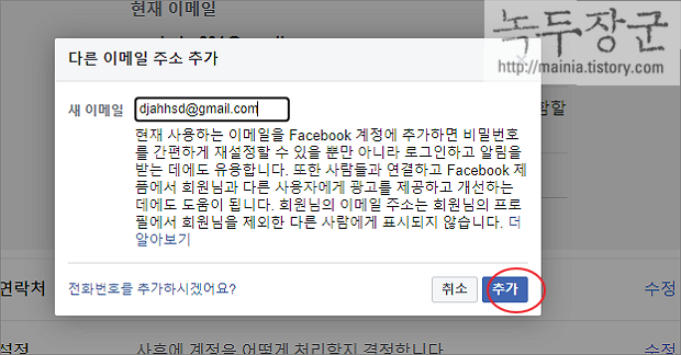 ▼ 연락처 수정 화면에는 [다른 이메일 또는 휴대폰 번호 추가] 링크를 클릭합니다. 이메일 또는 휴대폰 추가를 위한 팝업창이 뜹니다.