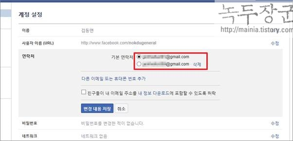 ▼ 메일에서 [확인] 버튼을 누르면 계정 설정 페이지로 이동합니다. 계정 설정의 연락처에는 인증이 끝난 새로운 이메일 아이디가 추가 되었습니다. 이제 계정 아이디를 변경하고 싶다면 기본 연락처를 추가한 이메일로 체크하시면 됩니다. 추가한 이메일의 삭제도 간단합니다. 이메일 오른쪽 끝에 삭제 버튼을 클릭해 주면 끝납니다.