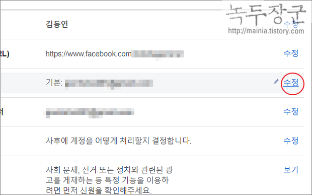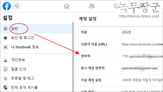 ▼ 설정 페이지에서 일반을 선택하시면 [계정 설정] 화면이 나옵니다. 계정 설정 목록에서 연락처 항목을 찾습니다.