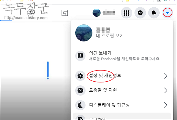 ▼ 계정 추가를 위해 오른쪽 상단에 화살표 아이콘을 클릭합니다. 메뉴 목록 창이 뜨면 아래쪽으로 내려가서 [설정 및 개인정보] 메뉴를 클릭합니다.