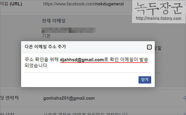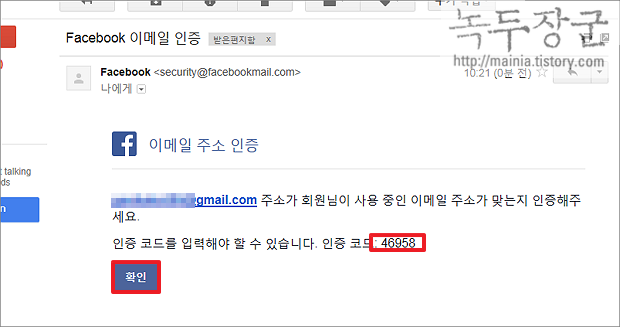 ▼ 마지막으로 추가한 이메일 계정에 대한 인증을 해야 합니다. 페이스북으로부터 받은 이메일 내용에서 [확인] 버튼을 클릭합니다. 만약 인증 코드 입력을 요구 한다면 메일에서 받은 숫자를 입력합니다.