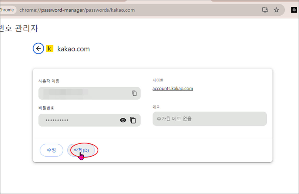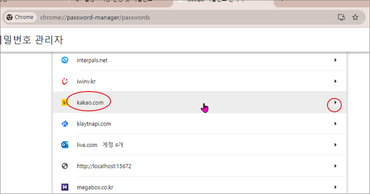 ▼ 비밀번호 관리자 화면에서 비밀번호를 삭제할 해당 사이트 주소를 찾습니다. 그리고 화살표를 눌러 창을 확대합니다.