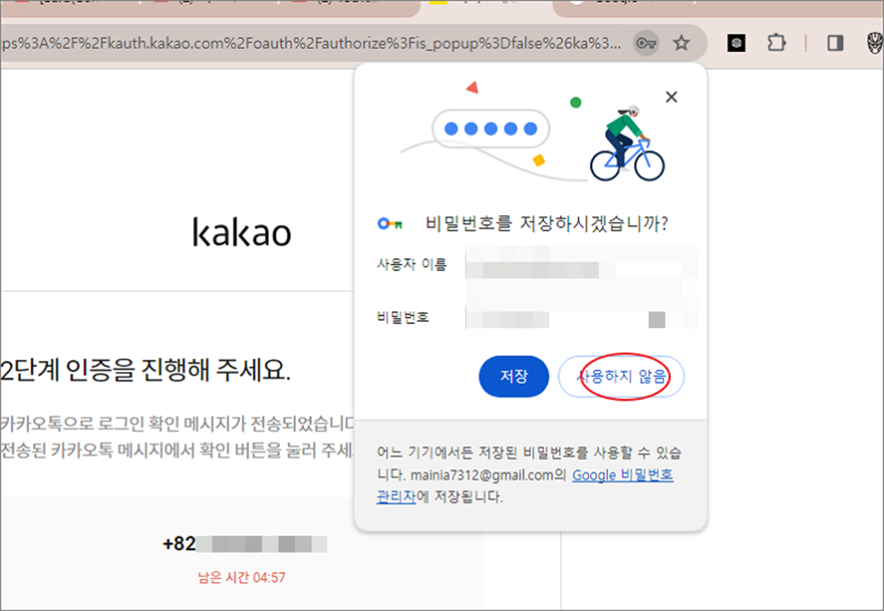 ▼ 비밀번호 저장은 그림과 같이 사이트에 로그인을 하게 되면 크롬에서는 입력한 정보를 다시 저장할 수 있도록 비밀번호 저장 기능이 뜹니다.