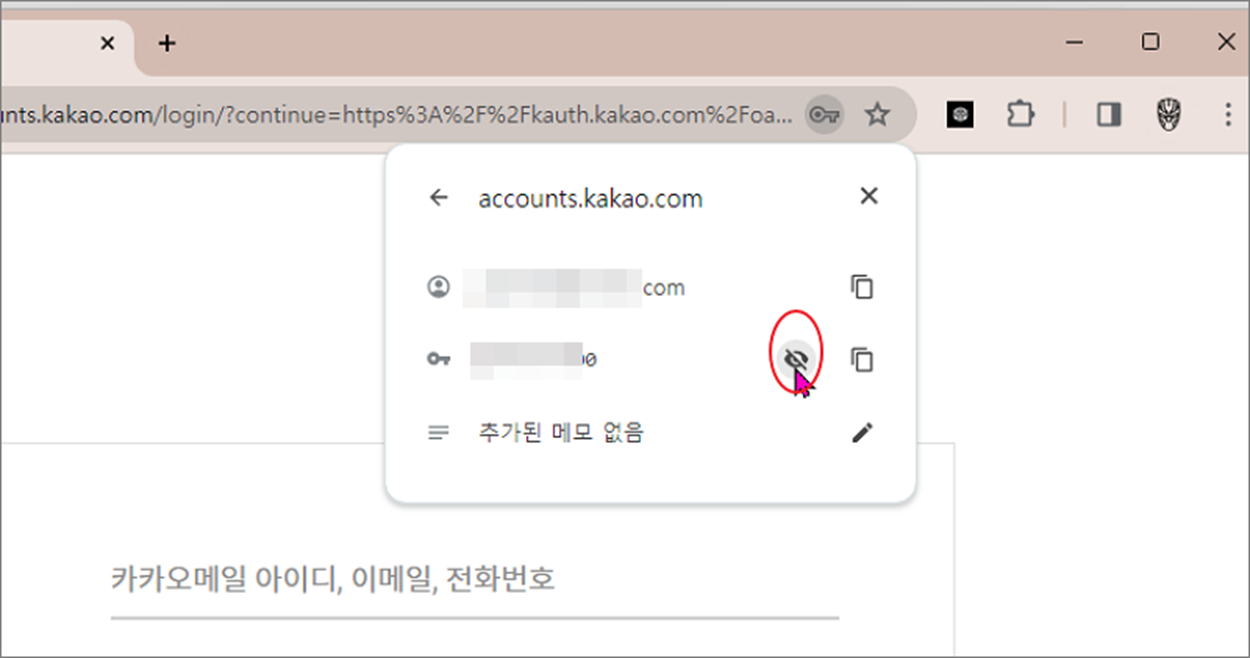 ▼ 사이트에 로그인 할 때 사용했던 아이디와 패스워드가 화면에 표시됩니다. 여기에 눈모양의 아이콘을 누르면 패스워드까지 확인이 가능합니다.