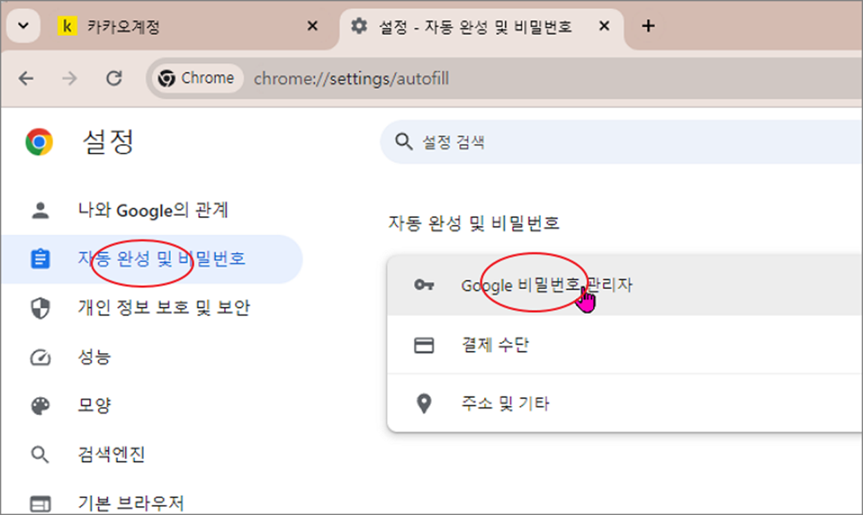▼ 설정 화면에서 왼쪽 사이드에 ‘자동 완성 및 비밀번호’ 메뉴를 선택합니다. 그리고 오른쪽으로 가서 ‘Google 비밀번호 관리자’ 메뉴를 클릭합니다.