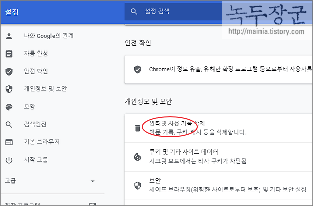 ▼ 두 번째 브라우저는 크롬입니다. 크롬도 설정 화면으로 이동합니다. 그리고 개인 정보 및 보안 섹션으로 가서 인터넷 사용기록 삭제 화면으로 이동합니다.