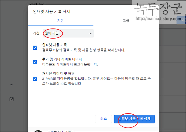 ▼ 인터넷 사용 기록 삭제 팝업창이 뜨면 기간을 전체로 하고 항목을 체크한 후 모두 삭제합니다. 익스플로러에서 했던 것과 같이 모든 데이터들을 삭제해 줍니다. 또 다른 체크 사항은 모든 사이트에서 자바스크립트가 항상 실행으로 되어 있는지 확인하는 것입니다. 자바스크립트는 브라우저에 포함되어 있는 동영상을 재생할 때 쓰이기 때문입니다.