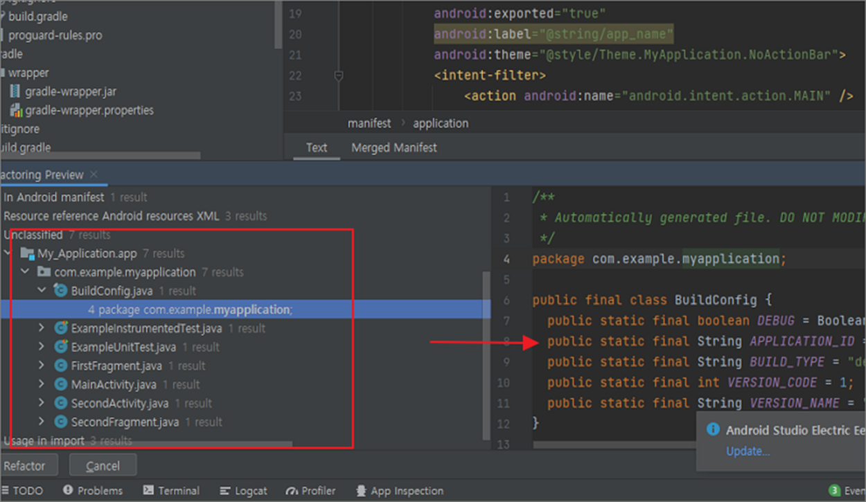 ▼ 만약 영향을 받는 파일들이 있다면 바로 패키지명을 변경하지 않습니다. 화면 하단 Refactoring Preview 창에 패키지 변경으로 수정작업이 필요한 파일 목록이 나옵니다. 문제가 없을지 다시 한번 체크합니다.