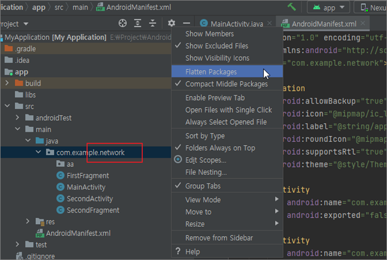 ▼ 안드로이드 개발을 시작하기 위해 프로젝트를 생성하면 기본 패키지 주소는 com.example 입니다. 나중에 자신의 도메인에 맞게 패키지 주소를 변경하기 위해서 어떻게 해야 할까요? 모든 소스에 추가한 import 문의 패키지 주소도 한번에 변경하기 위해서는 Refactor 기능을 사용해야 합니다. 패키지 주소를 선택하고 오른쪽 마우스 > Refactor > Rename 메뉴를 클릭합니다.