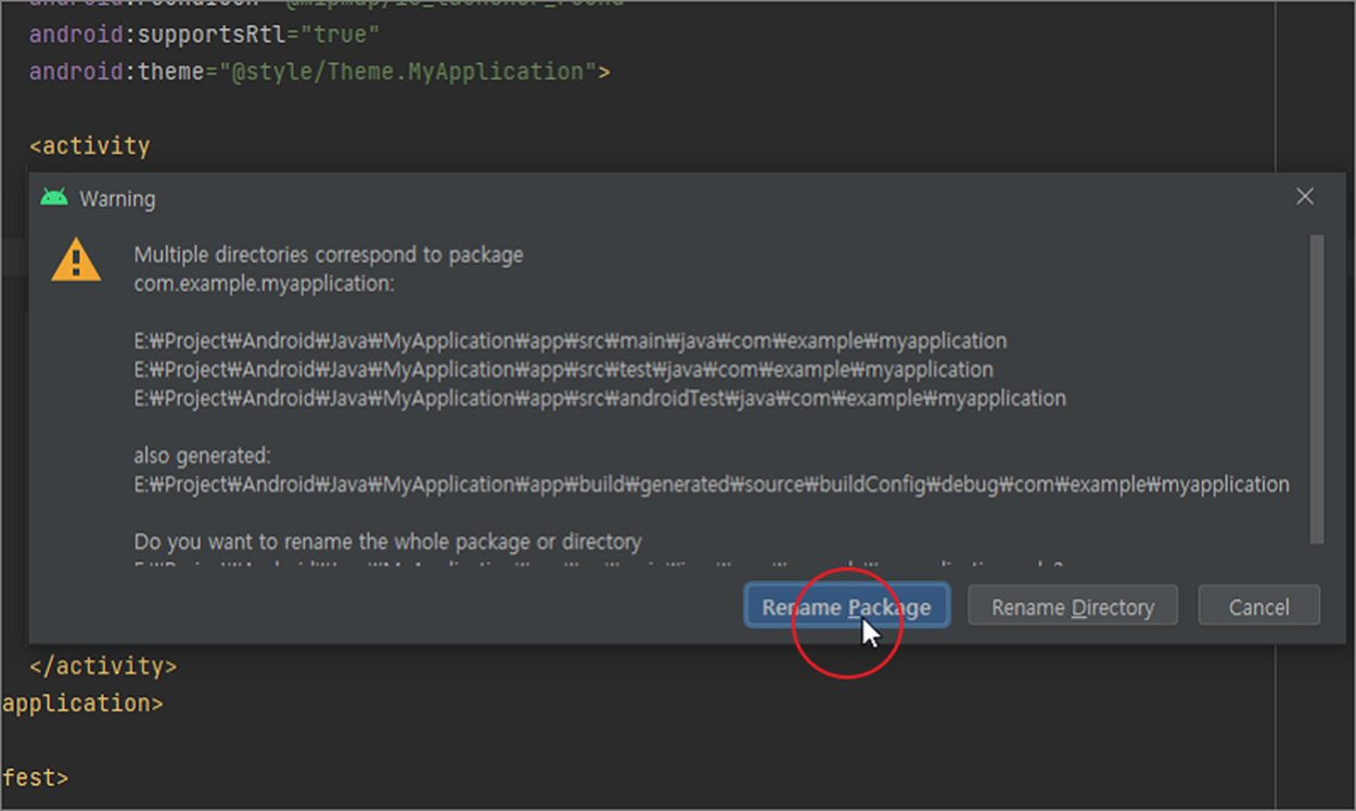 ▼ 팝업 경고창에는 패키지 주소와 함께 어떤 폴더들의 이름을 변경할 것인지 알려줍니다. 작업을 계속 진행하고 싶다면 Rename Package 버튼을 클릭합니다.