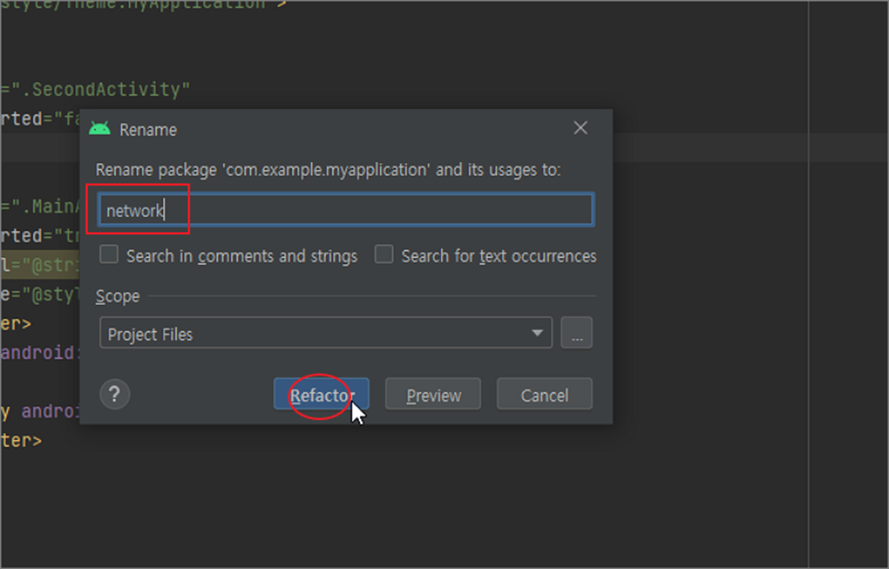 안드로이드 스튜디오에서는 패키지 주소를 변경했을 때 import 문이나 소스에서 참조하고 있는 주소명을 수동으로 일일이 고치지 않아도 됩니다. Refactor 기능을 이용하면 패키지와 관련된 모든 주소는 에러 없이 한 번에 수정할 수 있습니다. 이 기능은 소스 내에서 쓰는 변수명이나 클래스명도 포함됩니다. 이름 변경으로 인한 에러를 조금이라도 빠르게 수정하고 싶다면 Refactor 기능을 이용해 보세요.