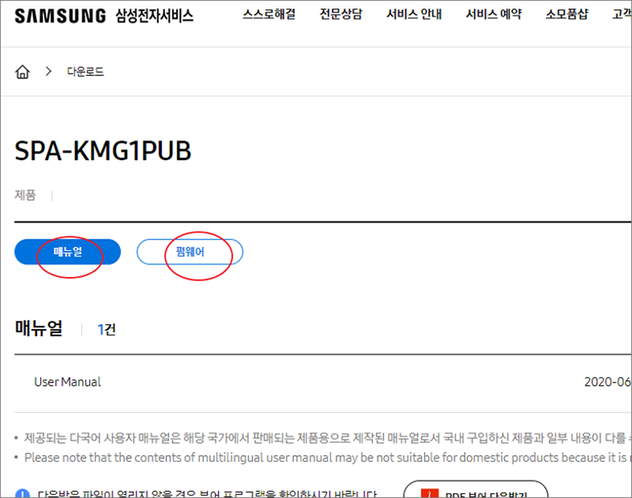 ▼ 제품 다운로드 상세 화면에서 상단 매뉴얼, 펌웨어를 클릭하고 아래로 내려갑니다.