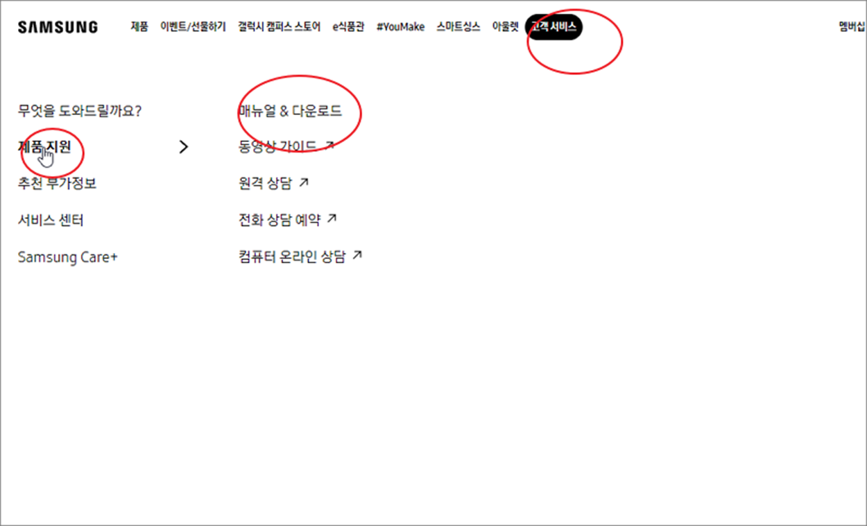 ▼ PC 인 경우 브라우저의 좌우를 넓혀서 상단에 메뉴가 나타나도록 합니다. 고객서비스 > 제품 지원 > 매뉴얼 다운로드 메뉴를 클릭합니다.
