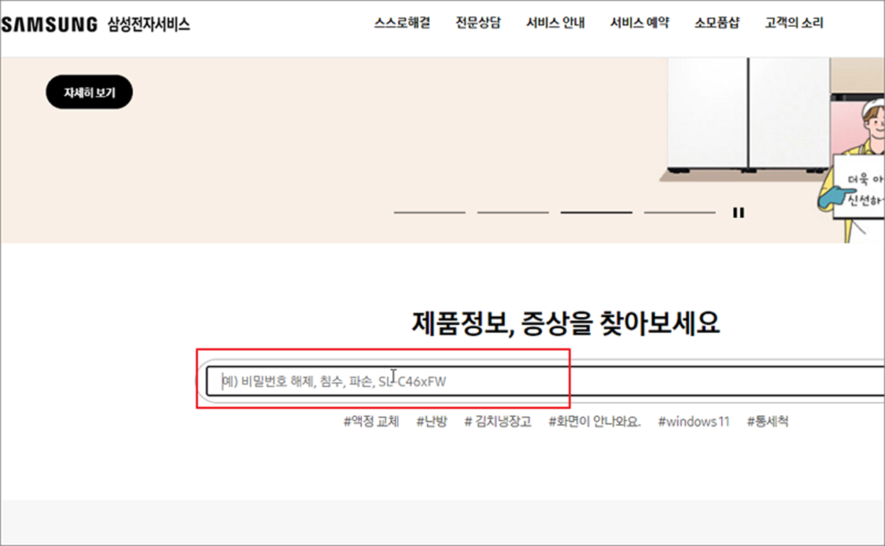 ▼ 두 번째는 삼성전자 서비스 홈페이지를 이용한 방법입니다. 방법은 유사합니다. 홈페이지 접속한 후 화면 중앙 제품정보 입력란을 이용합니다.