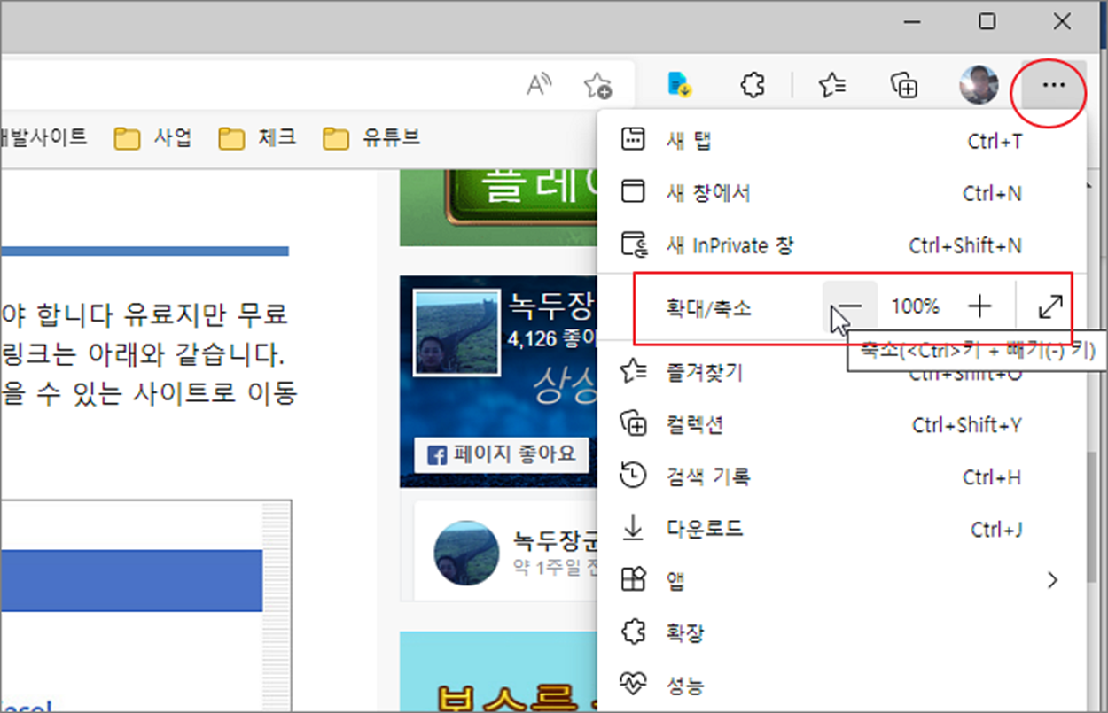 ▼ 첫 번째로 엣지 브라우저에 있는 메뉴를 이용해서 크기를 변경하는 방법입니다. 오른쪽 상단에 [더보기]를 클릭하면 메뉴 목록에 [확대/축소]가 나타납니다. 기본 100%에서 양 옆에 있는 “+/-“ 를 클릭하면 25% 씩 증가시키거나 줄일 수 있습니다.
