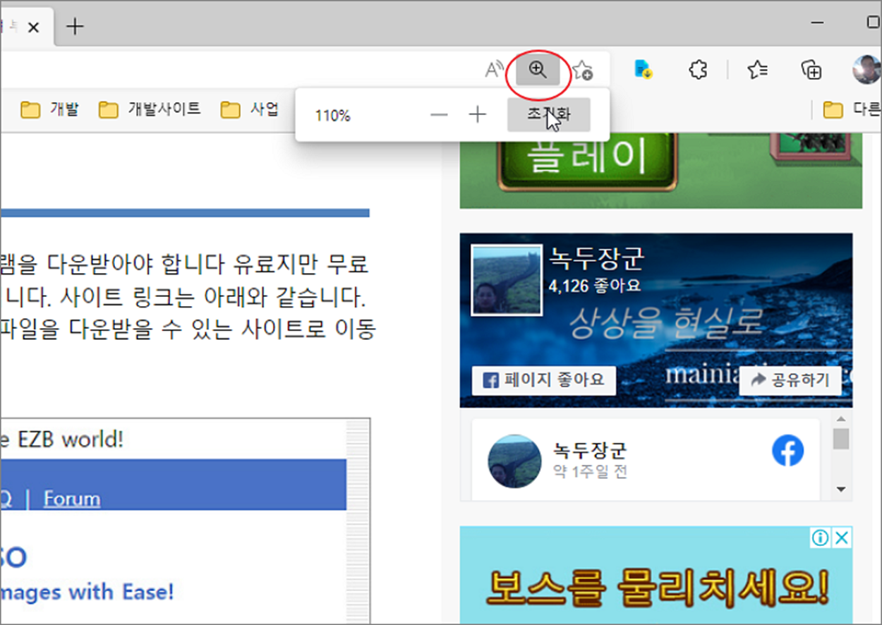 ▼ 그림에서처럼 “+/-“ 로 조절한 숫자만큼 브라우저에 내용을 확대하거나 축소 시킬 수 있습니다. 단, 25% 단위로 움직일 수 있으며 숫자를 직접 수정하지는 못합니다.