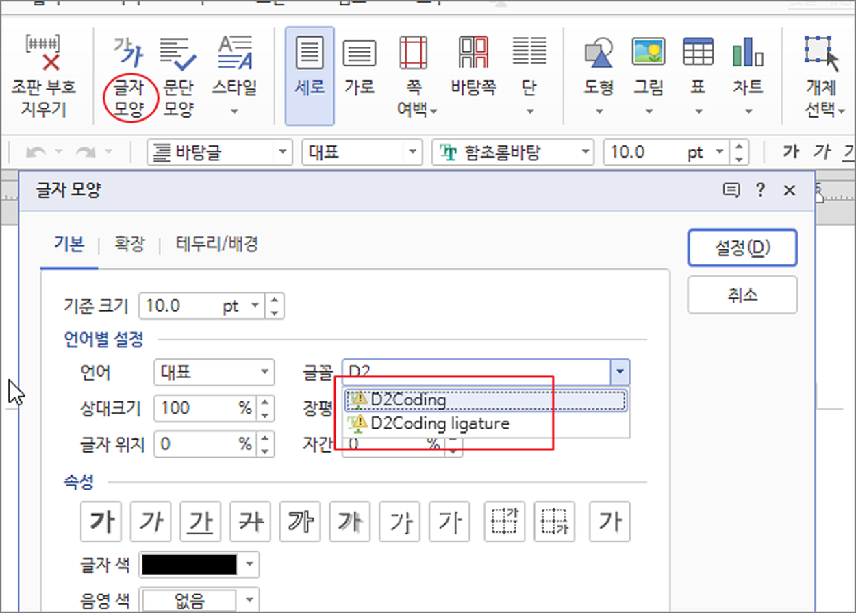▼ 글꼴 설치가 끝났다면 한글에서 제대로 인식하는지 확인해 보겠습니다. 글꼴 설치 전에 한글 프로그램이 실행되어 있었다면 다시 시작합니다. 다음 상단 리본 메뉴에서 홈 탭 > 글자 모양 을 클릭합니다. 글자 모양 > 기본 탭으로 이동한 뒤 글꼴 항목을 클릭해서 찾아보세요.