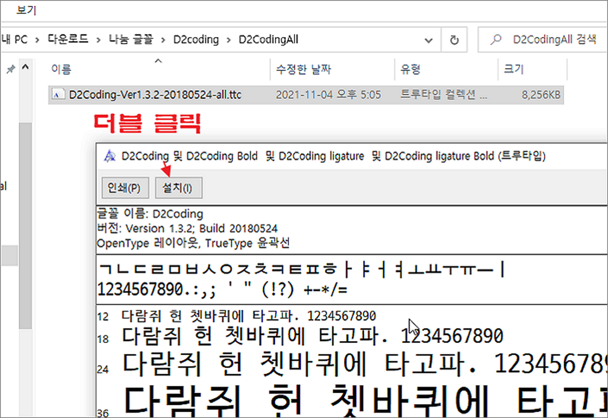 ▼ 해당 폴더 안에는 글꼴 파일이 있을 겁니다. 확장자는 보통 TTC, TTF 입니다. 파일을 더블 클릭하면 설치 유무를 묻는 창이 뜹니다. 팝업창에서 설치 버튼을 누릅니다. 이렇게 글꼴 관리 시스템 폴더로 가지 않아도 클릭 한 번에 설치가 가능합니다.