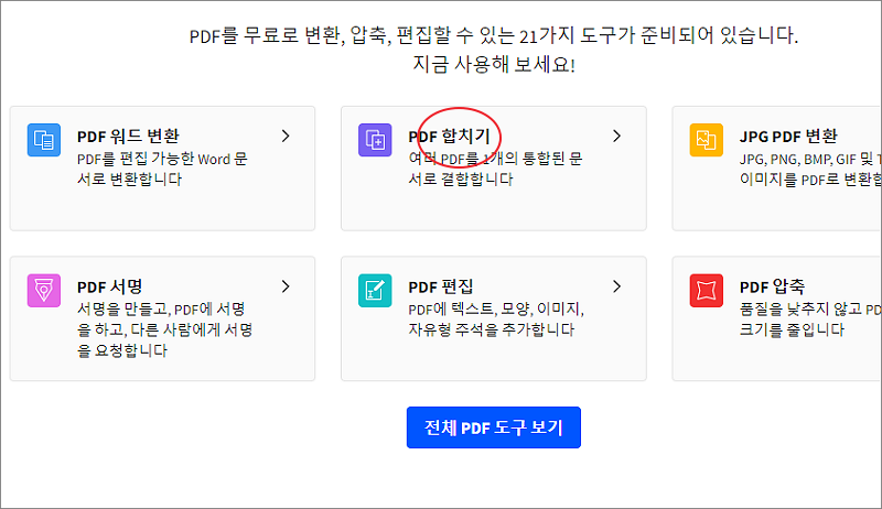 ▼ 화면 아래로 내려가면 어떤 PDF 편집이 가능한지 도구 목록이 나타납니다. 이중에서 "PDF 합치기" 를 클릭합니다.