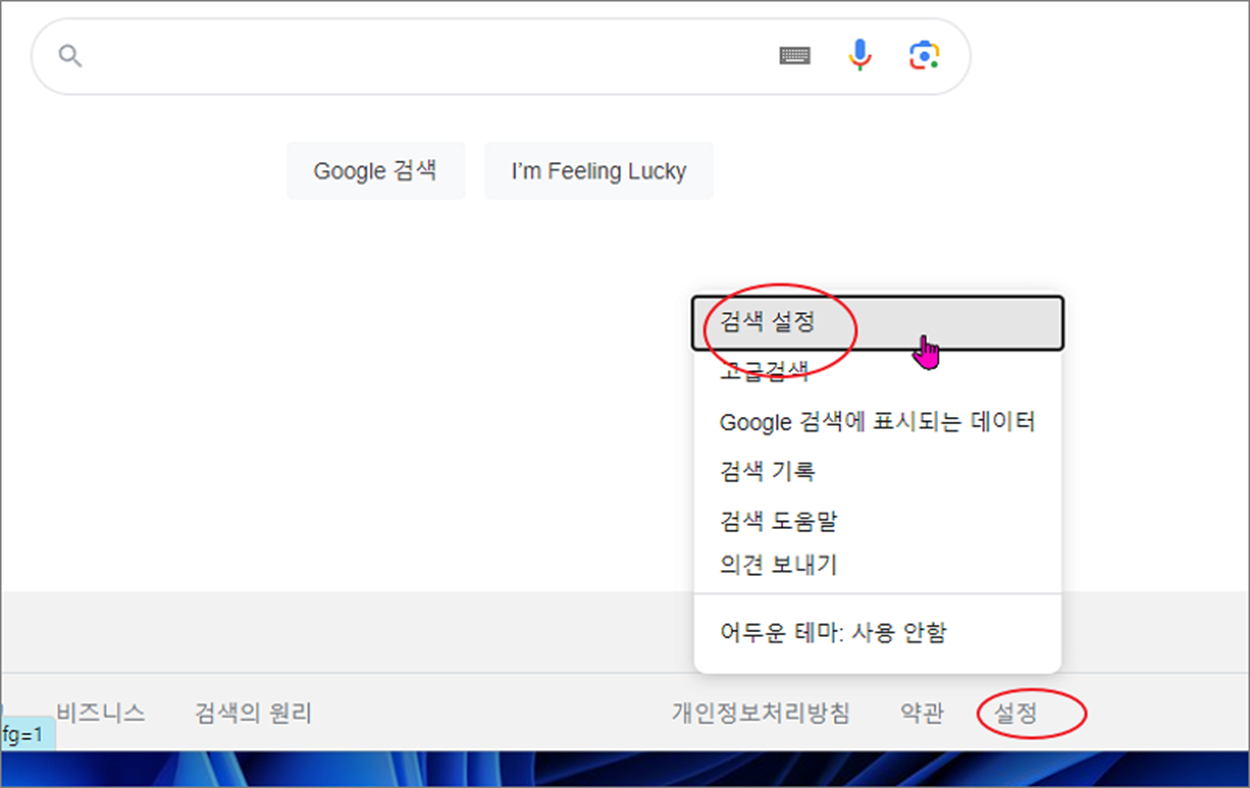 ▼ 화면 아래에 보시면 설정 버튼을 볼 수 있습니다. "설정" 을 클릭하고 하위 메뉴에 [검색 설정]을 선택합니다.
