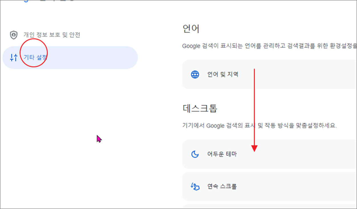 ▼ 검색 설정 화면에서 왼쪽 사이드에 "기타 설정" 을 선택합니다. 그리고 오른쪽 화면에서 아래로 내려갑니다.
