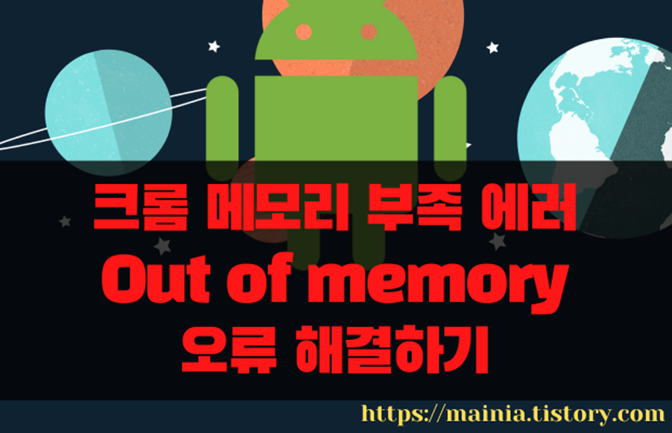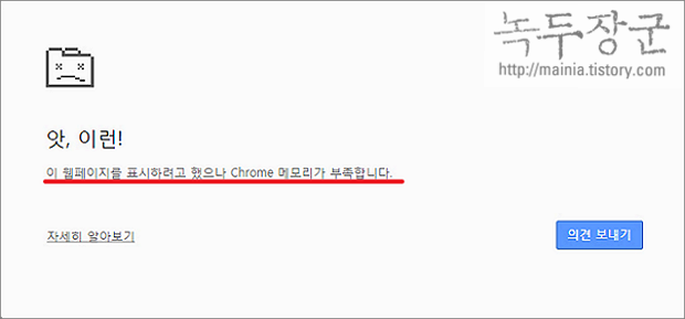▼ 그림처럼 크롬을 오래 사용하다 보면 메모리가 부족하다는 메시지와 함께 화면에 아무것도 나오지 않습니다. 이런 메시지가 뜨지 않게 하려면 지금까지 저장한 브라우저 저장 정보들을 삭제해 줘야 합니다.