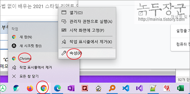 ▼ no sandbox 옵션이란 보안 기능인 샌드박스를 사용하지 않겠다는 의미입니다. 악성코드에 취약할 수 있는 옵션으로 컴퓨터에 설치된 백신의 실시간 감시를 항상 켜 놓고 사용합니다. no sandbox 로 실행하기 위해서는 크롬 속성창을 열어야 합니다. 크롬 실행 아이콘에서 오른쪽 마우스, 다시 Chrome 메뉴에서 오른쪽 마우스 두 번을 연속해서 누르면 속성 메뉴가 나타납니다.