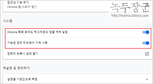 | ◎ 백그라운드 실행, 하드웨어 가속 여부 확인 |