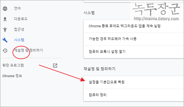 ▼ 다음은 크롬의 모든 설정을 초기화합니다. 고급 > 재설정 및 정리하기 메뉴를 선택합니다. 하위 옵션에서 설정을 기본값으로 복원 을 클릭합니다.