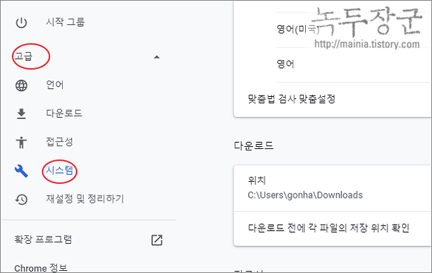 ▼ 다음은 시스템 옵션에서 백그라운드 실행과 하드웨어 가속 옵션을 활성화하는 것입니다. 위에서 설명한 인터넷 캐시 정보로 해결이 안된다면 두 옵션을 켭니다. 노트북을 사용하시는 분들은 배터리 소모나 성능에 지장을 준다고 끄는 경우가 있습니다. 왼쪽 사이드 고급 > 시스템 메뉴를 선택합니다.