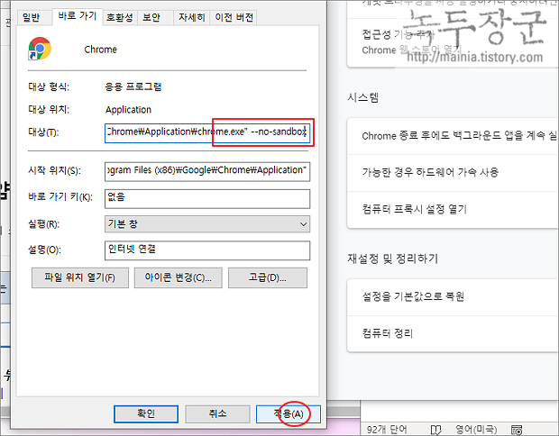 ▼ 크롬 속성 창에서 바로 가기 탭의 대상 항목으로 갑니다. 크롬 실행 파일 경로 끝에 --no-sandbox 라고 입력하고 적용 버튼을 눌러 창을 닫습니다. 이전에 실행했던 크롬 창은 모두 닫기 다시 실행했을 때 옵션이 적용됩니다.