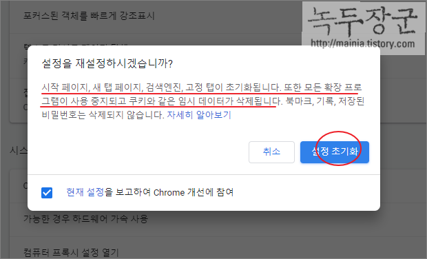 ▼ 재설정을 묻는 팝업창에는 초기화를 진행할 경우 어떤 정보를 삭제하고 남기는지 알려 주고 있습니다. 북마크나 웹 사이트 비밀번호 등은 삭제를 하지 않는다고 하네요.